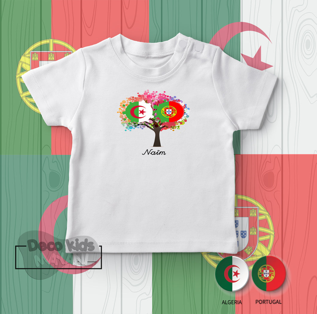 T shirt Portugal Algerie enfant personnalisé. T-shirt 100% coton manches courtes. Lavable en machine à 30° sur l'envers.
