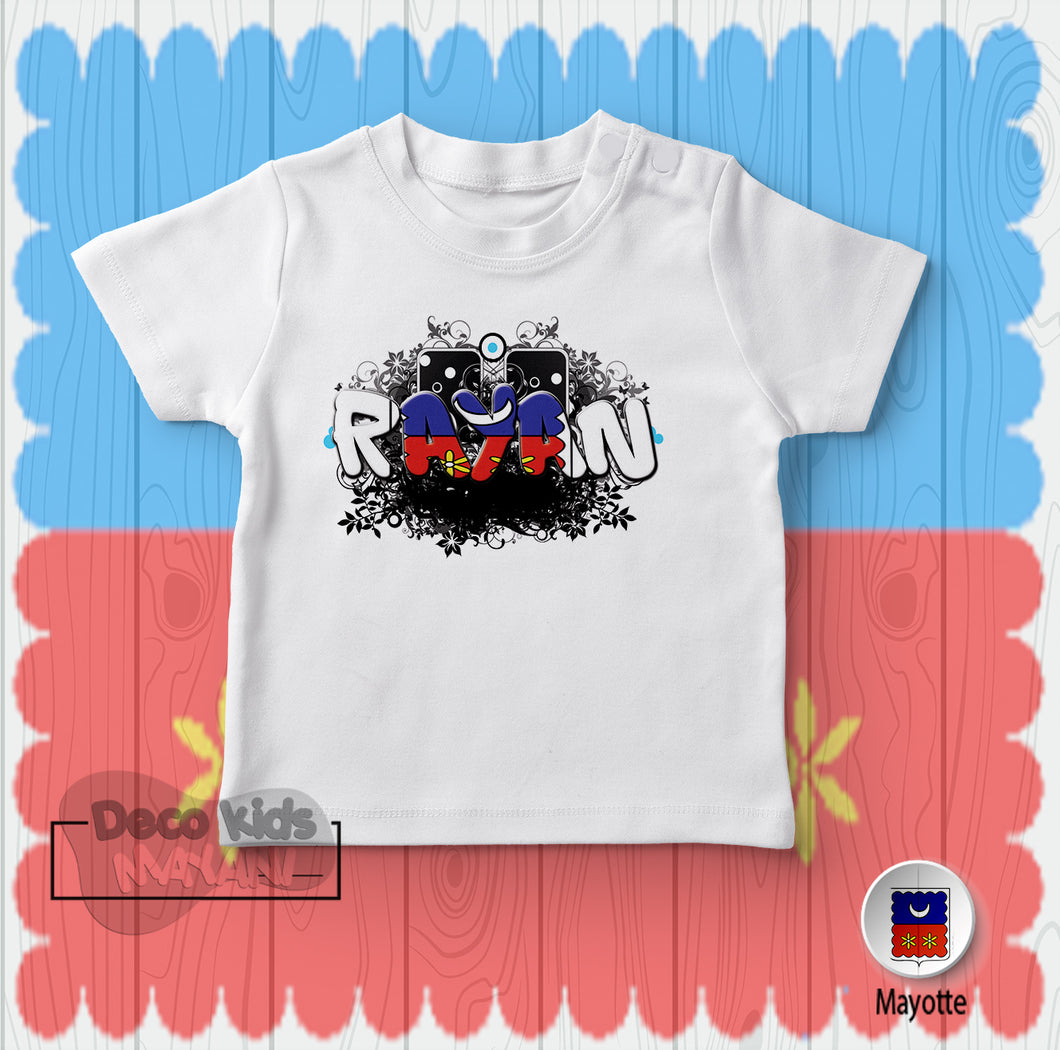T-shirt Mayotte enfant personnalisé avec drapeau de Mayotte. T-shirt 100% coton manches courtes. Lavable en machine à 30° sur l'envers. Programme court.